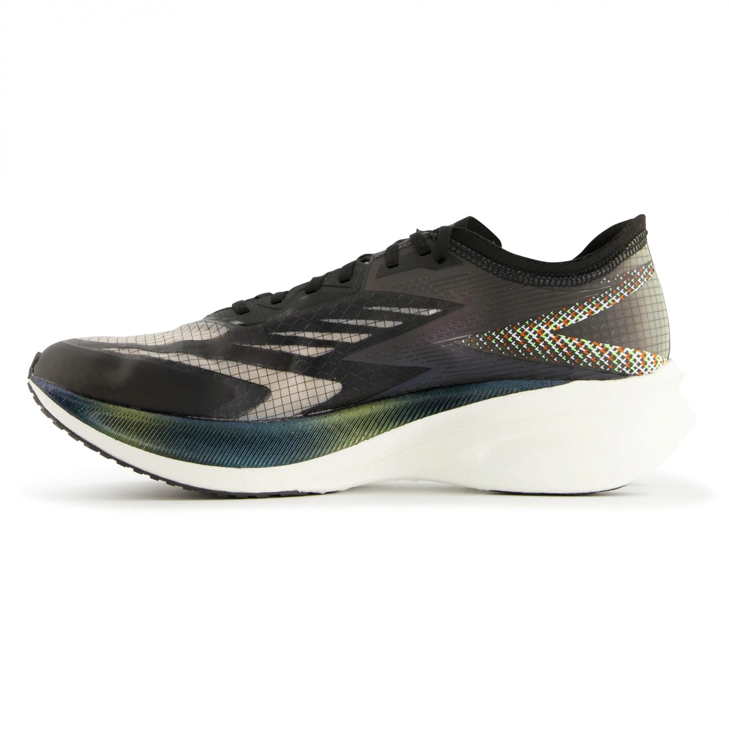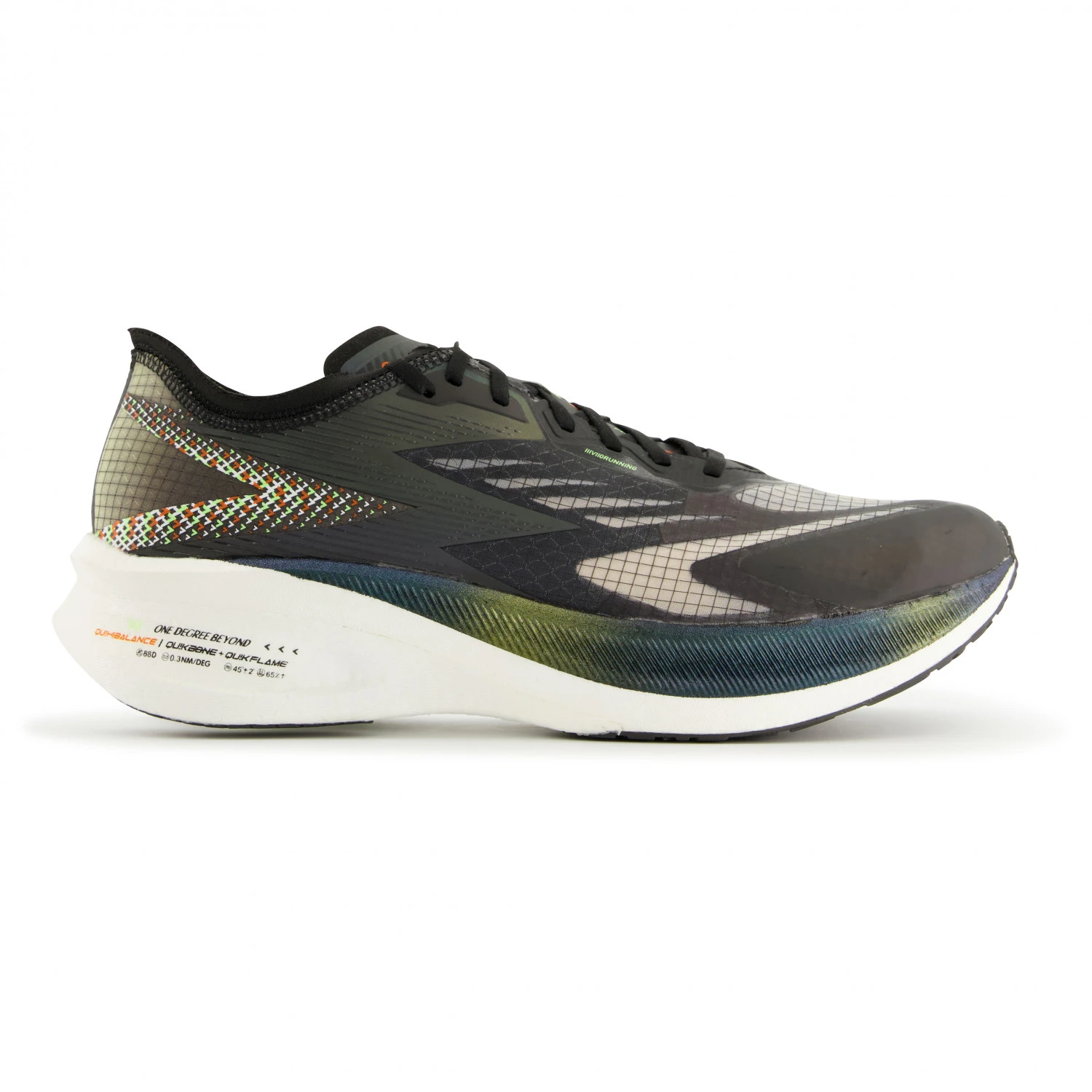 Les chaussures Flame de la marque 361° sont idéales pour participer à des courses et pour battre vos records ! La tige en monomesh est ultralégère et très fonctionnelle. La languette souple et anatomique soulage la pression exercée sur le dos du pied et assure, avec le rembourrage au niveau du talon, un confort agréable. La construction de semelle Qu!kbalance, développée par 361°, intègre une semelle intercalaire Qu!kflame en polyuréthane amortissant. Elle est extrêmement flexible et beaucoup plus légère qu’une semelle traditionnelle. À cela s’ajoute la semelle extérieure Qu!kflame qui est solide et antidérapante, donc elle fournit l’adhérence nécessaire. Entre les deux semelles, il y a une plaque de carbone Qu!kbone sur toute la longueur, pour soutenir davantage le pied et améliorer le retour d’énergie.